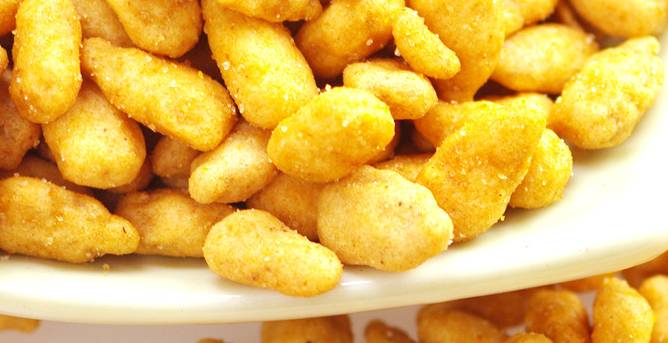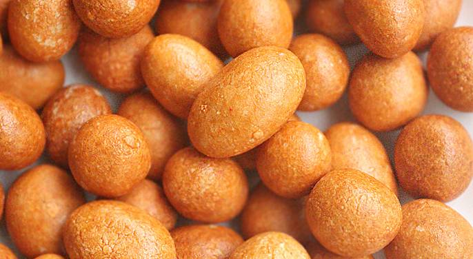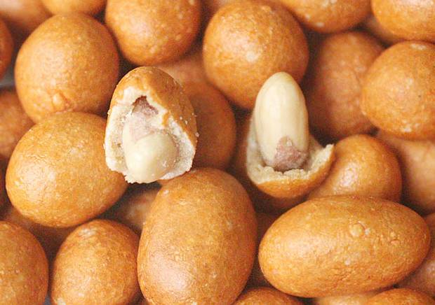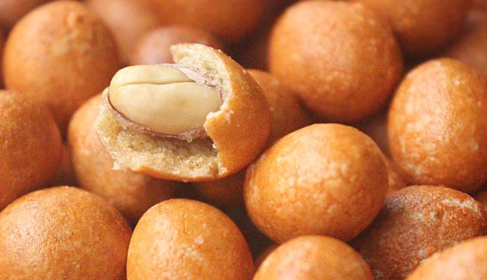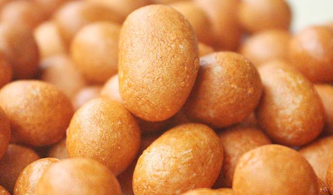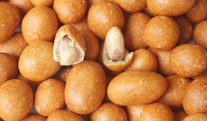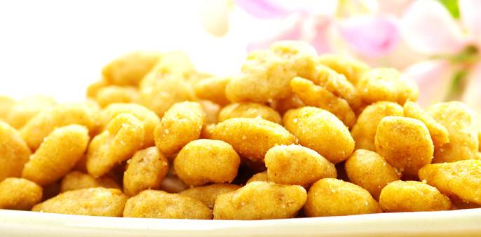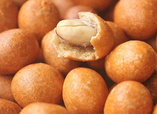 鱼皮花生,以花生仁、糕粉、白糖、淀粉等为主要原料精制而成。外表呈黄褐色,颗颗圆实光滑,饱满均匀,鲜香诱人。咬一颗在口中,咸香,浅浅的咸味中带着甘甜的味道。